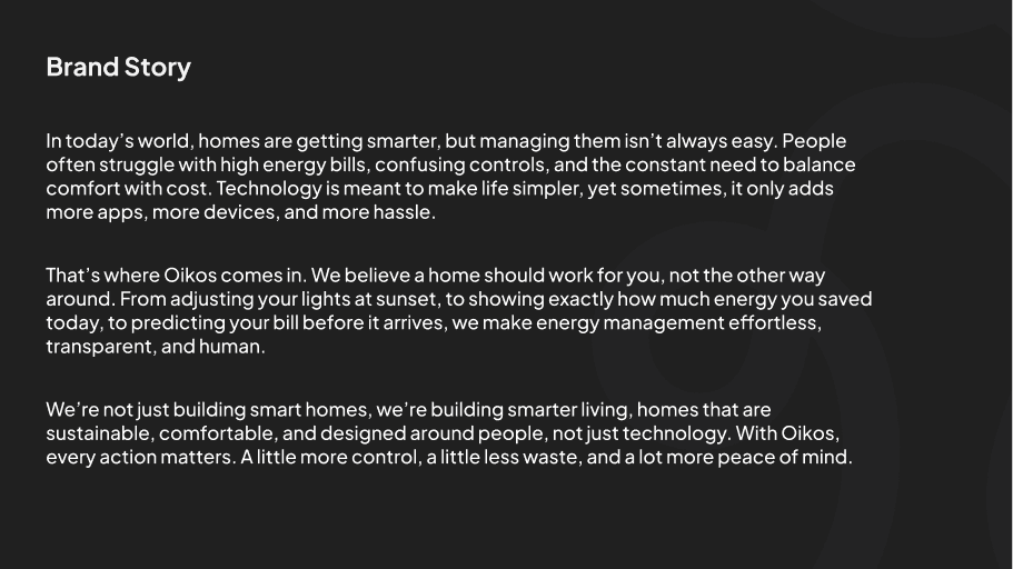 OIKOS proposes an omnichannel ecosystem that connects smart devices, retail guidance, installation support, and dashboards into one cohesive experience. By combining real-time energy insights, simple controls, predictive bill awareness, and human-assisted onboarding, the system helps users balance comfort and cost without cognitive overload. The design emphasizes trust and clarity, making energy savings understandable and sustainable.