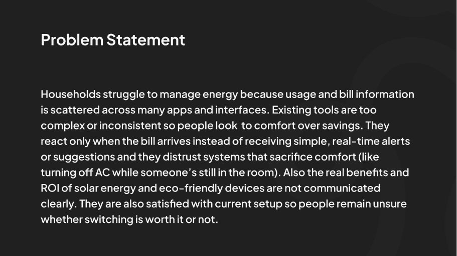 Households struggle to manage energy usage because information is scattered across multiple apps, devices, and offline channels. Existing smart home systems feel complex, unreliable, and difficult to trust, causing users to prioritize comfort over savings. Poor after-sales support, unclear ROI of energy-efficient devices, and lack of real-time feedback further reduce adoption, making energy management reactive rather than proactive.