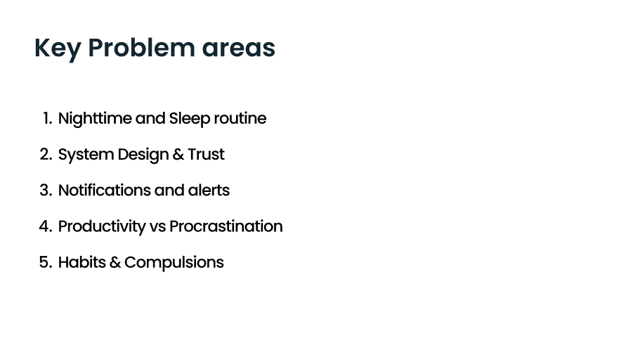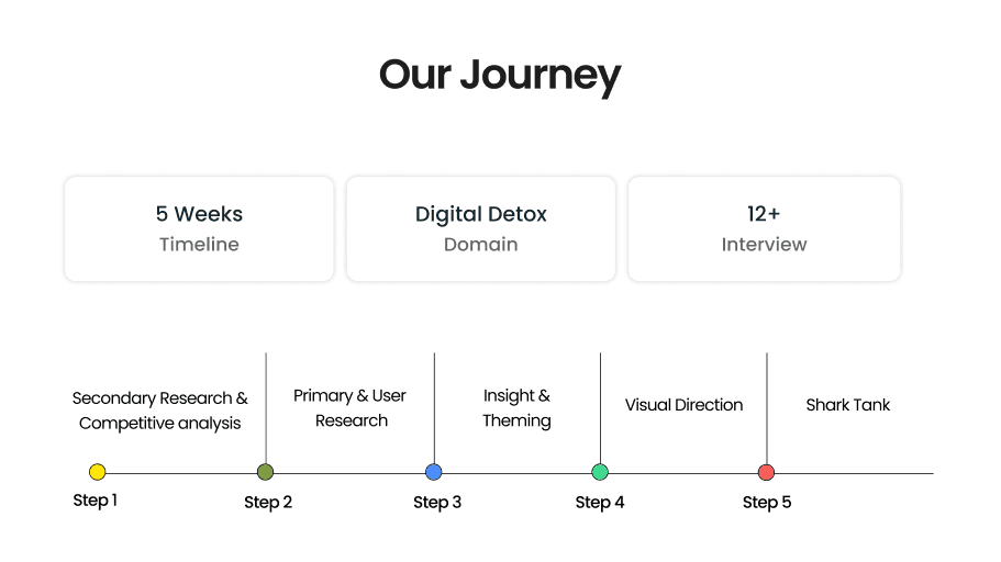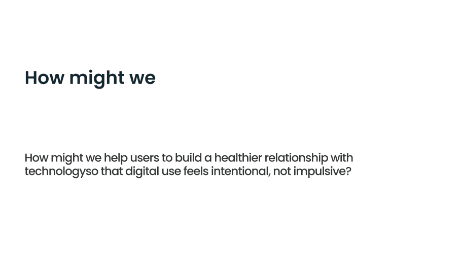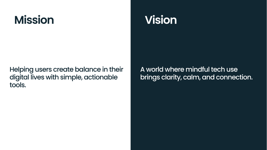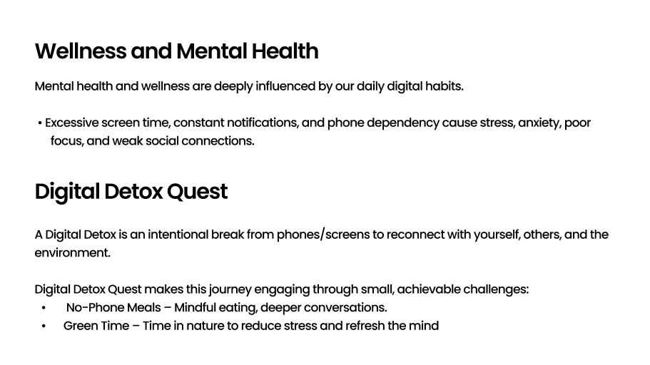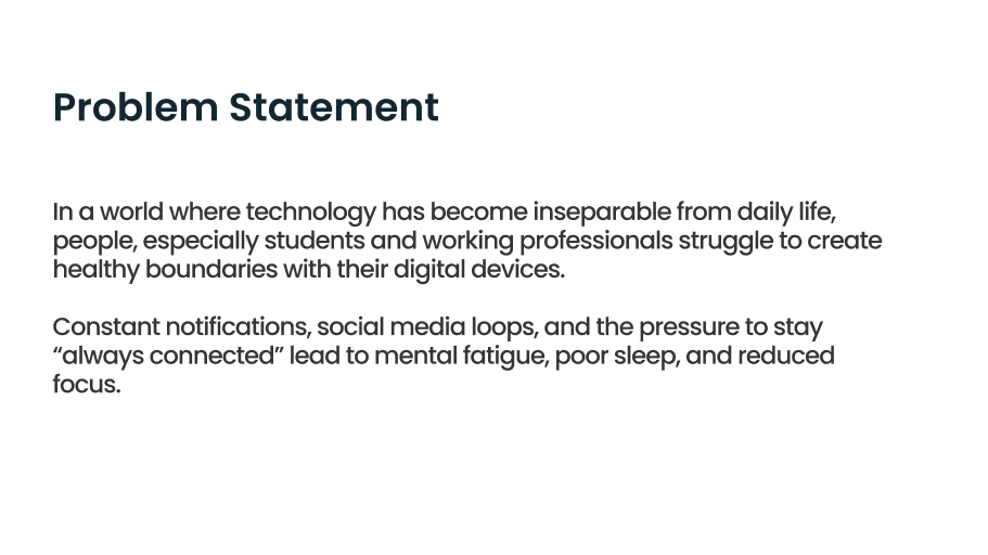Students and working professionals struggle to set healthy boundaries with their digital devices. Constant notifications, compulsive scrolling, and “always-on” culture lead to stress, poor sleep, reduced focus, and mental fatigue. Existing detox apps often become another source of distraction, making it difficult for users to build trust and sustain mindful tech habits.