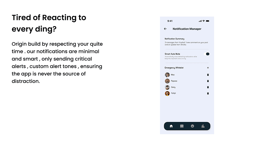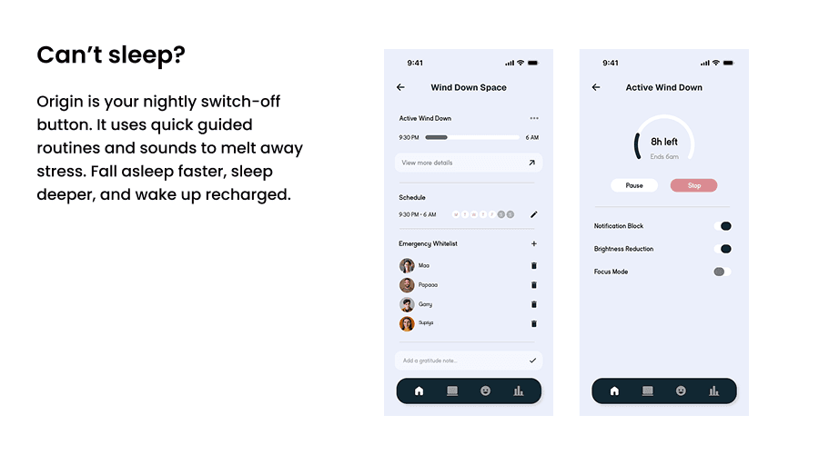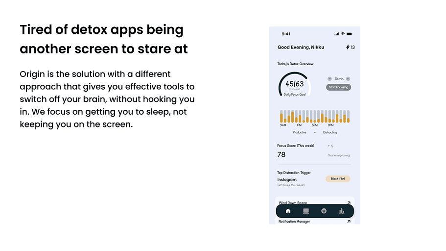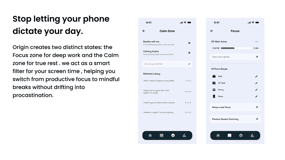 ORIGIN introduces a calm, behavior-driven digital detox experience through small, achievable challenges and intentional system design. Features like Calm zones, minimal notifications, and sleep-friendly flows help users be mindful without feeling restricted. By respecting quiet time and reducing cognitive load, ORIGIN supports healthier habits instead of enforcing screen ban.